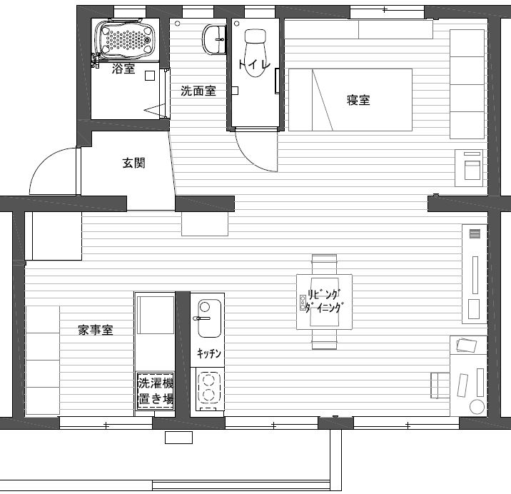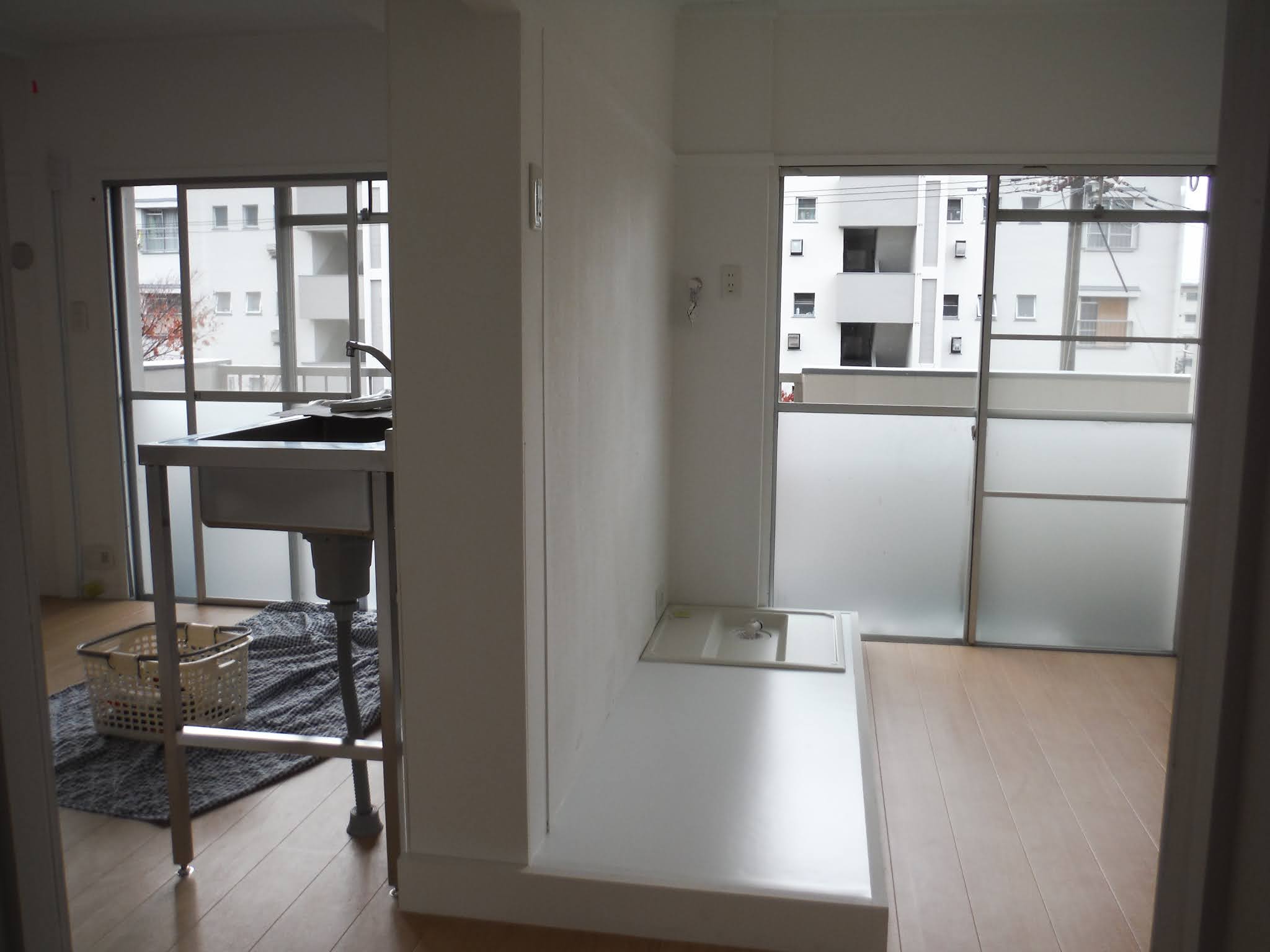 洗濯機を隠せるのがメリットです。ただしキッチンまでの配水管が長くなるため団地によっては不可能なこともあります。可能かどうかは解体してみないとわからないこともあるのでケース1になることも想定して計画した方がよいでしょう。