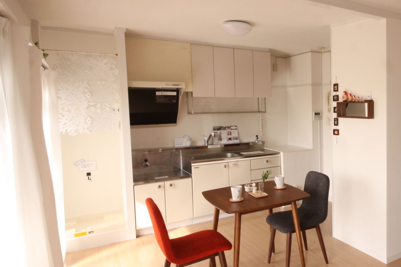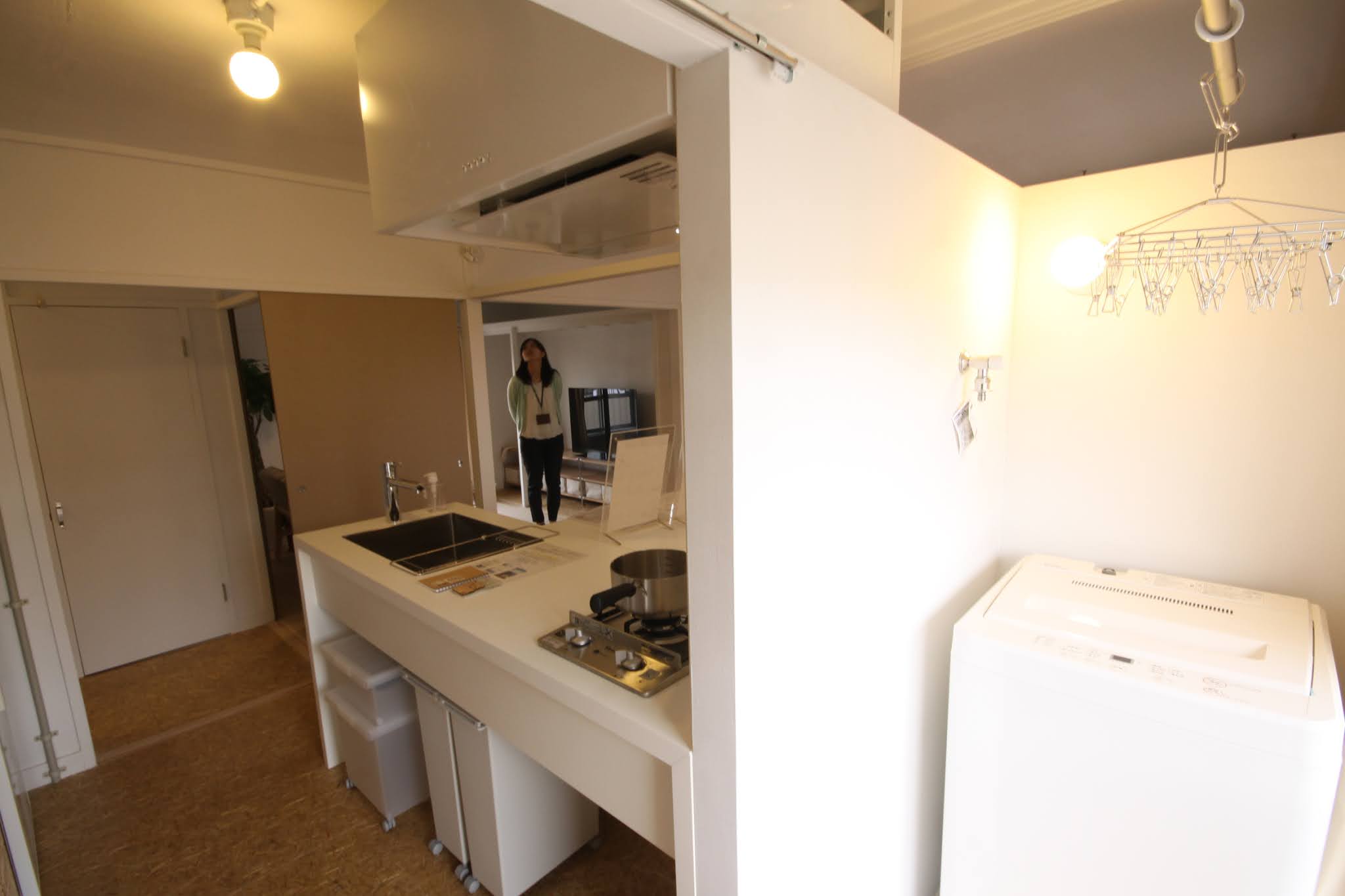 キッチンの排水に接続しやすい、料理と洗濯が隣同士になるので家事がしやすいというメリットがあります。団地はキッチンの横にバルコニーがあることが多いため物干しがしやすいという長所もあります。デメリットはリビングダイニングから洗濯機が見えることです。気にならない人には問題ないですが気になる人にとっては避けたいところでしょう。MUJI×URのリノベでは洗濯機周りを囲い込むことによってこの問題を解決しています。